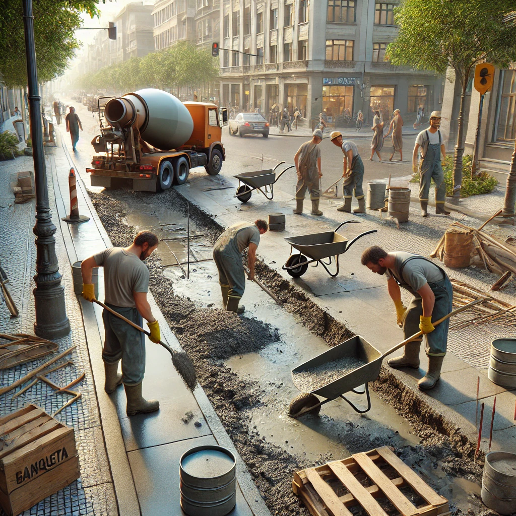 Proceso de restaurar una acera dañada para asegurar la seguridad de los peatones, cumpliendo con las normativas urbanas de mantenimiento y accesibilidad.